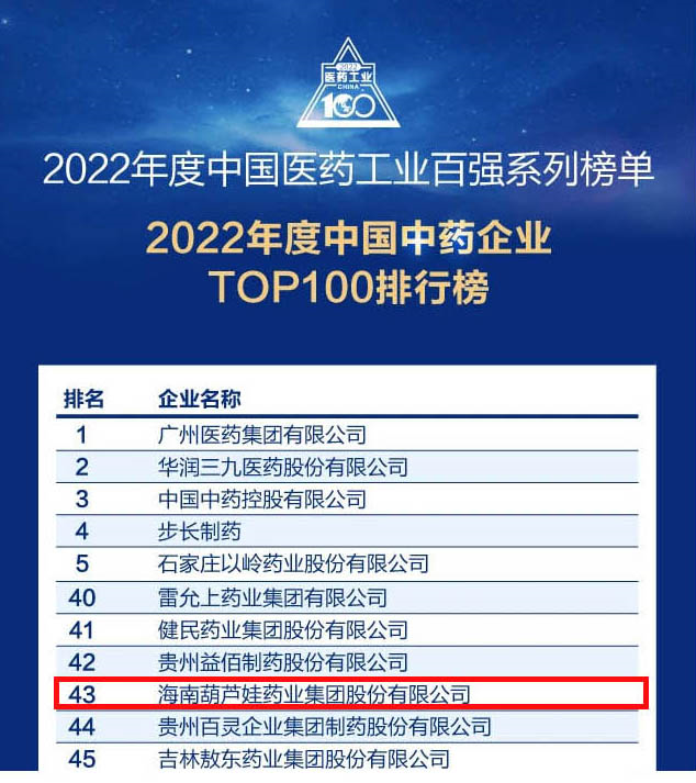 会议期间,一年一度的中国医药工业百强系列榜单隆重揭晓,k8凯发药业集团凭借领先的研发优势和扎实的生产实力以及稳健的市场推广能力,连续第四年成功入选“2022年度中国中药企业TOP100排行榜” ,排名稳步上升至第43位。